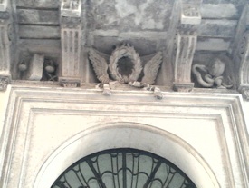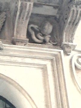 But every detail has his importance. If you enter by the backdoor (from the Piazza Sant’Eustachio, you will notice the decoration above the door underneath the balcony. A little rebus, made by Borromini himself. On the left hand side we see the images of a sword, a book and a wage. Opposite we have a snake looking in a mirror. Before you enter, you would know already in what kind of building you’re coming. It’s a University. The first three images are representing what you will study in a medieval university: the book for philosophy and theology, the sword for ius or law and the wage stands for medicines. All tree disciplines are bringing you to wisdom.